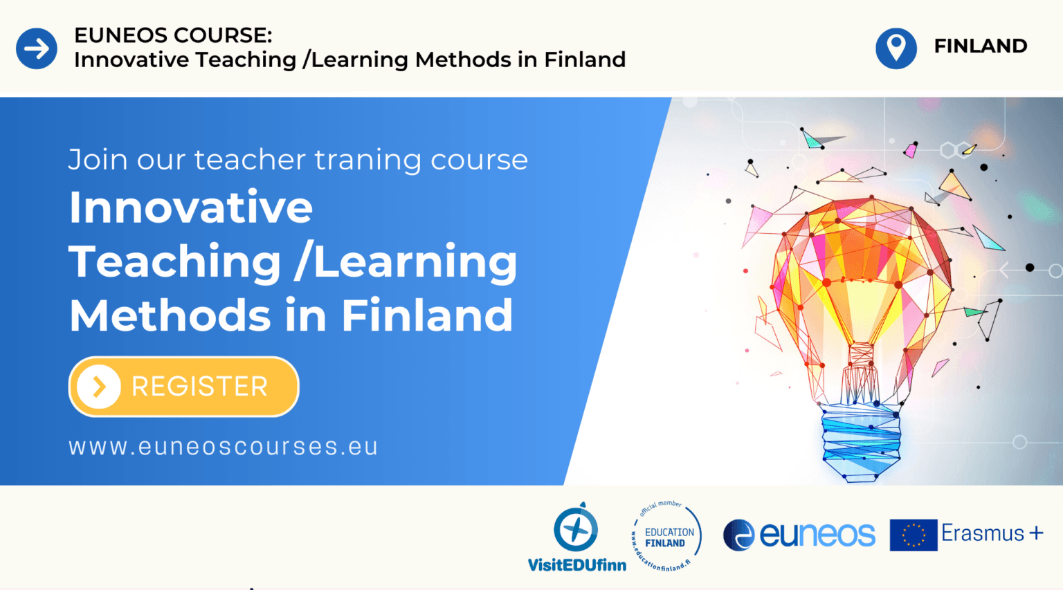 VisitEDUfinn (OID CODE: E10020922 / PIC CODE: 899855324) and Euneos Corporation (OID CODE:E10124150 / PIC CODE 950782555) organise ERASMUS+ Staff Mobility job shadowing and professional courses designed for teachers at all levels. Our programs are organized in different parts of Finland in cooperation with other stakeholders in the field of education (schools, universities, municipalities).