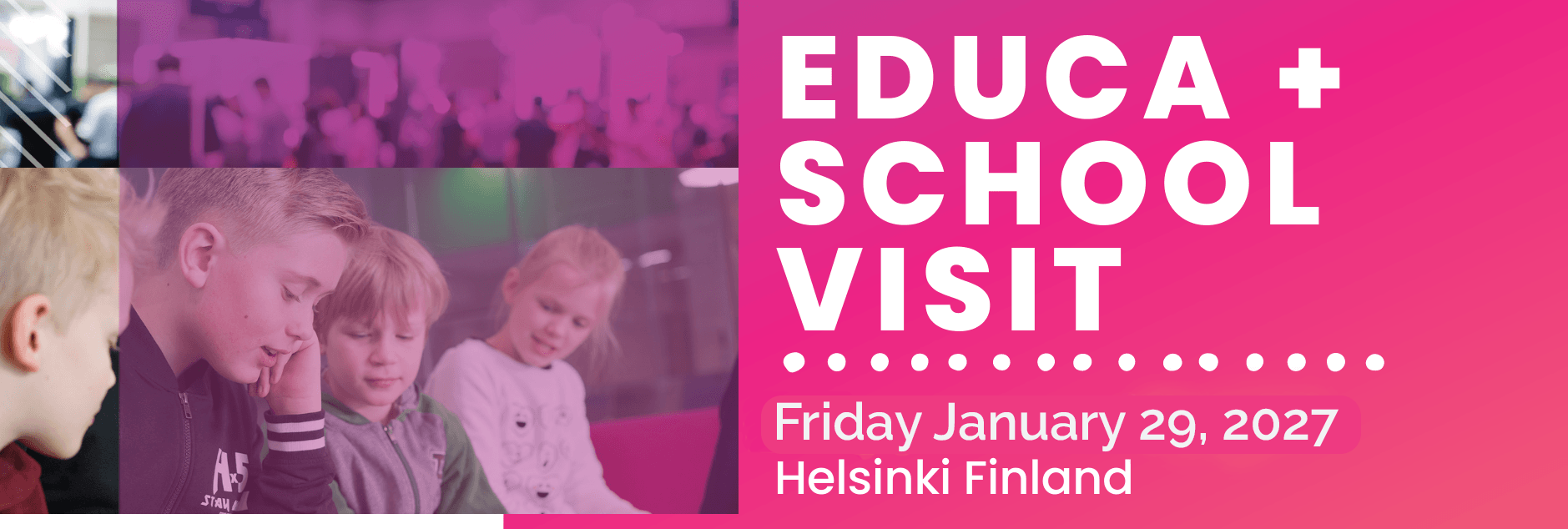 | 8:30 | Educa School Visit starts Meeting point: Helsinki Expo and Convention Centre, Messukeskus at the main entrance. Look for an EDUCA School Visit -sign. |
